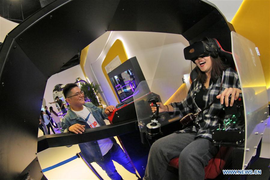 A tourist experiences virtual reality game in Yantai, east China's Shandong Province, Oct. 2, 2018, the second day of the week-long National Day holiday. (Xinhua/Tang Ke)