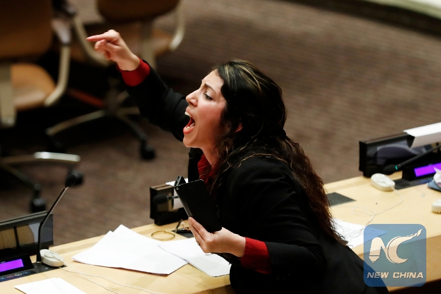 A Cuban diplomat chants slogans during the "Jailed for What?" campaign, at the United Nations headquarters in New York, Oct. 16, 2018. A United States-sponsored campaign aimed at criticizing the human rights situation in Cuba on Tuesday encountered strong and fierce protest at the UN. (Xinhua/Li Muzi)