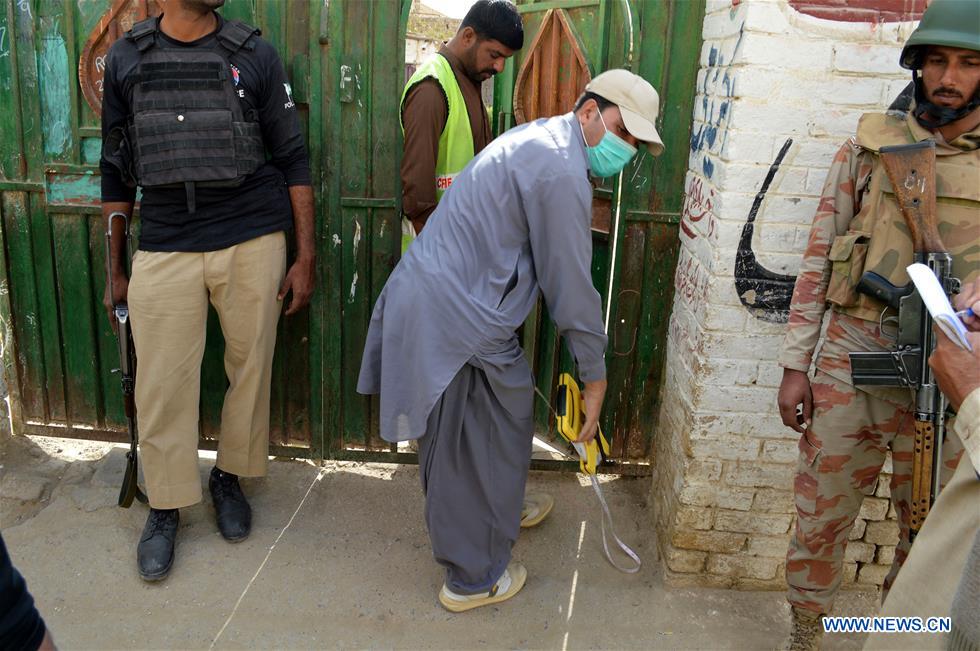 Pakistani security officials inspect the shooting site outside a school in southwest Pakistan's Quetta on Oct. 24, 2018. At least four kids were injured when unknown gunmen attacked a school in Pakistan's southwest Quetta city on Wednesday. (Xinhua/Irfan)