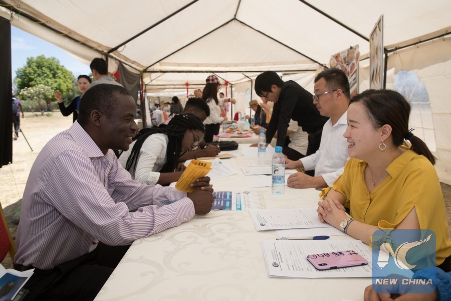 Representatives of Chinese enterprises talk with job seekers during a jobs expo at the University of Zambia in Lusaka, Zambia, Oct. 26, 2018. (Xinhua/Peng Lijun)