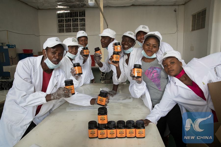 Workers at Mpund Wild Honey, a Chinese-run firm, show the fully packaged honey in central Zambia's Kabwe town, on Nov. 3, 2018. (Xinhua/Peng Lijun)