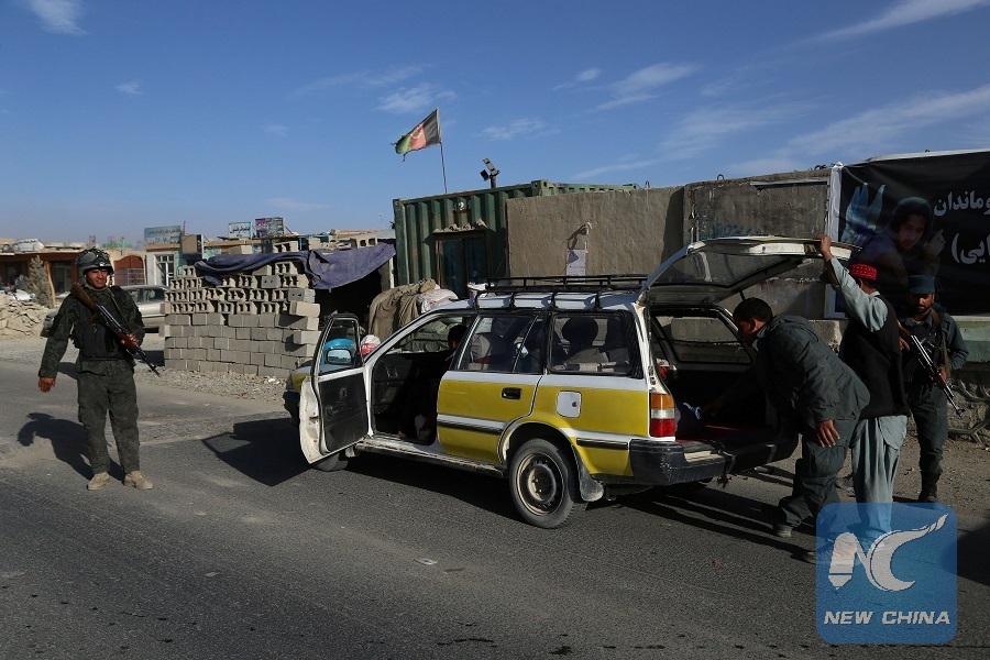 An Afghan policeman checks a vehicle at a security checkpoint on the way leading to Jaghori district in Ghazni province, Afghanistan, Nov. 7, 2018. (Xinhua/Sayed Mominzadah)
