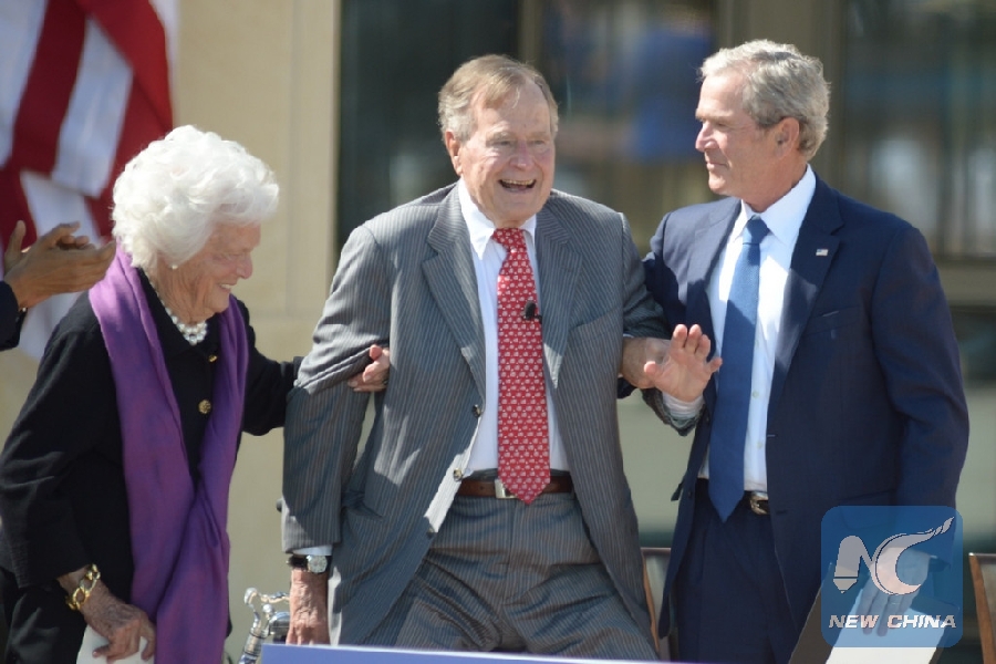 File photo taken on April 25, 2013 shows former U.S. President George H. W. Bush (C) taking part in the unveiling ceremony of his son George W. Bush's presidential library in Dallas, the United States. (Xinhua/Xu Xun)