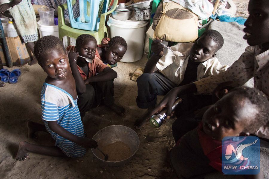 File photo shows children are eating at Mangaten camp in Juba, capital of South Sudan, Sept. 14, 2018.(Xinhua/Denis Elamu)