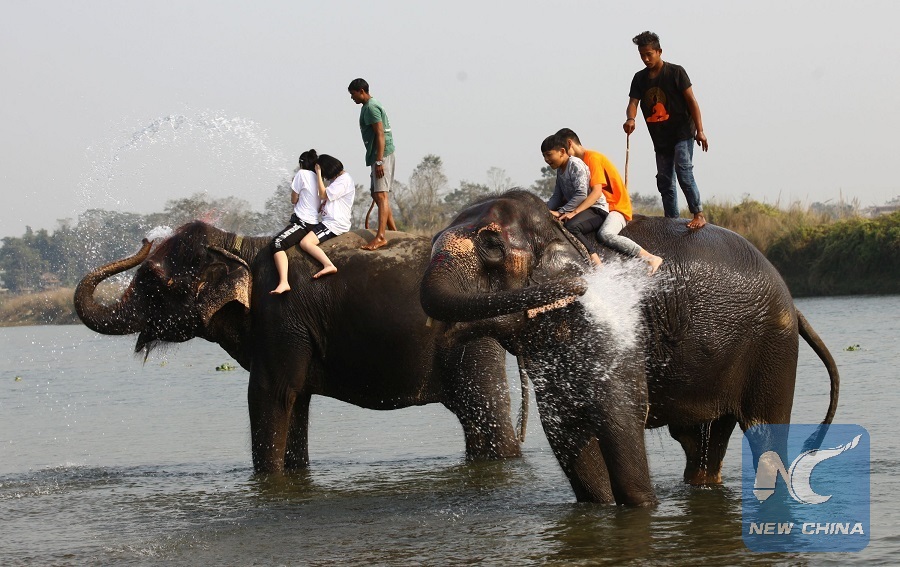 Tourists enjoy elephant bathing during the 15th Elephant Festival in Sauraha, a tourism hub in southwest Nepal's Chitwan district on Dec. 27, 2018. (Xinhua/Sunil Sharma)