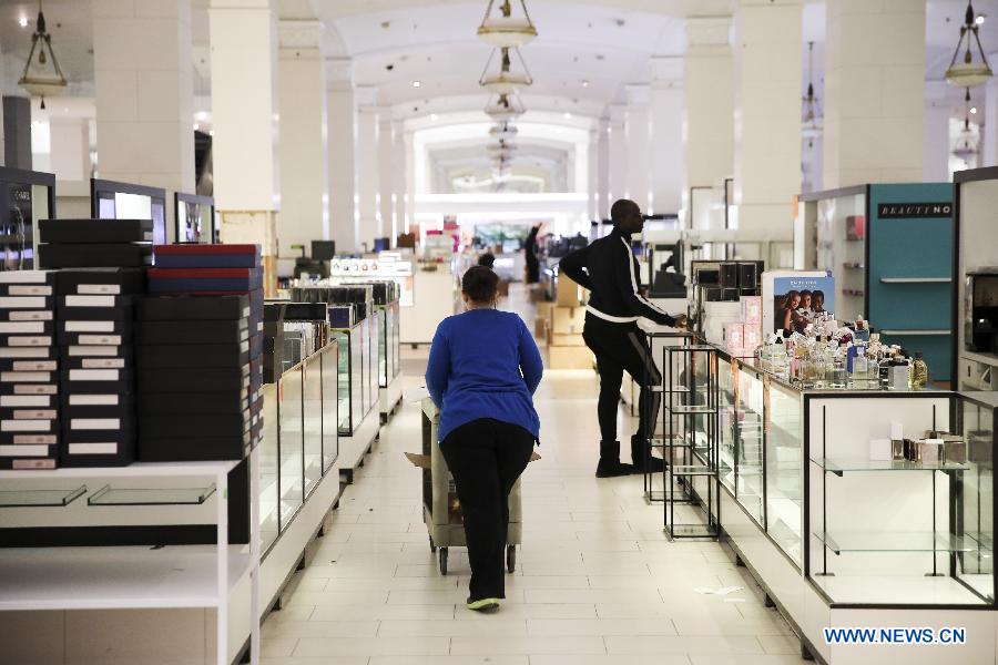Staff members clear goods at Lord & Taylor flagship store on Fifth avenue in Manhattan, New York City, the United States, on Jan. 3, 2019. The famous department store chain Lord & Taylor officially closed its flagship store on Fifth avenue in Manhattan. The 11-storey building was a landmark on New York's most prestigious shopping area for over a century, boasting about its animated holiday windows and fine selection of jewelries and clothing and attracting city dwellers and tourists alike. (Xinhua/Wang Ying)