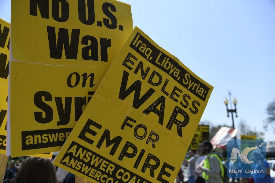 File Photo: People protest against U.S. strike on Syria outside the White House in Washington D.C., the United States, on April 14, 2018. (Xinhua/Yang Chenglin)