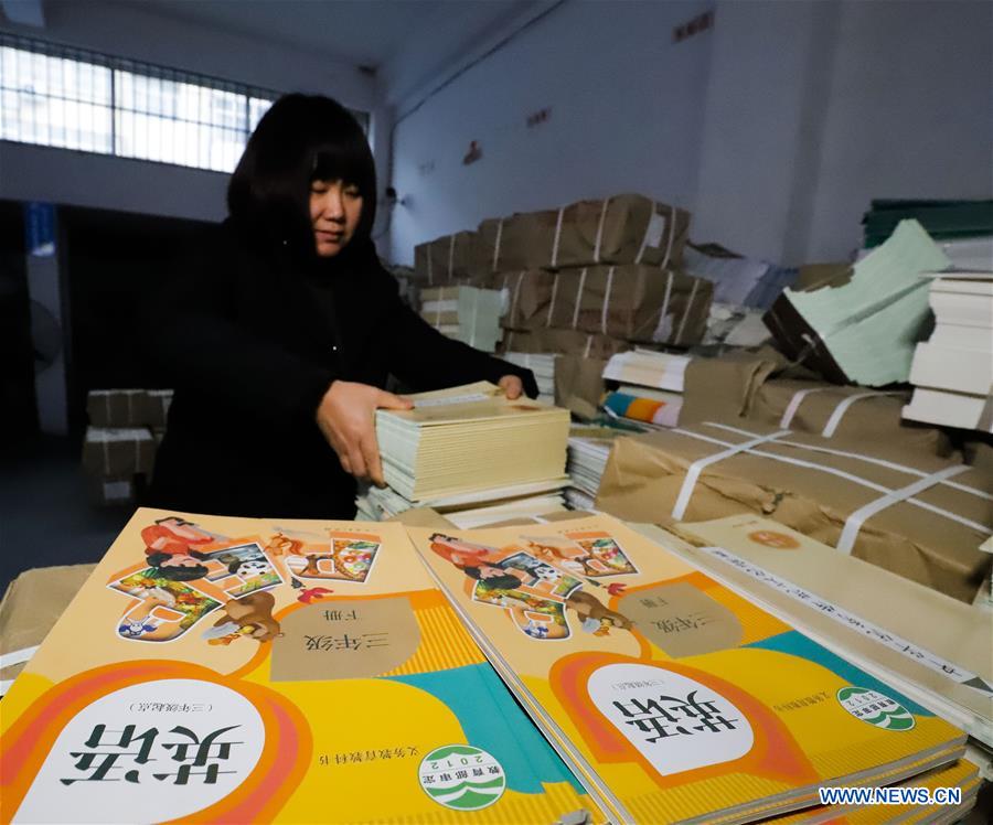 A staff member arranges the new textbooks to be sent to schools for the upcoming new semester at Zunhua Branch of Xinhua Bookstore in Tangshan, north China's Hebei Province, Feb. 12, 2019. Chinese students will start a new semester after the winter vacation in late February. (Xinhua/Liu Mancang)