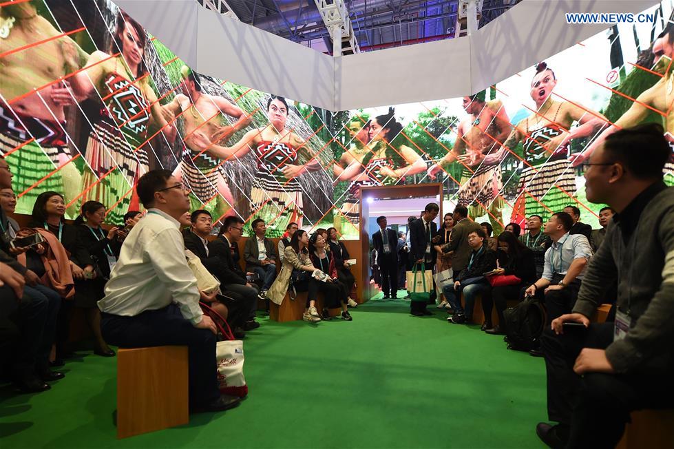 Visitors watch video at the booth of New Zealand at the first China International Import Expo (CIIE) in Shanghai, east China, Nov. 6, 2018. (Xinhua/Han Yuqing)