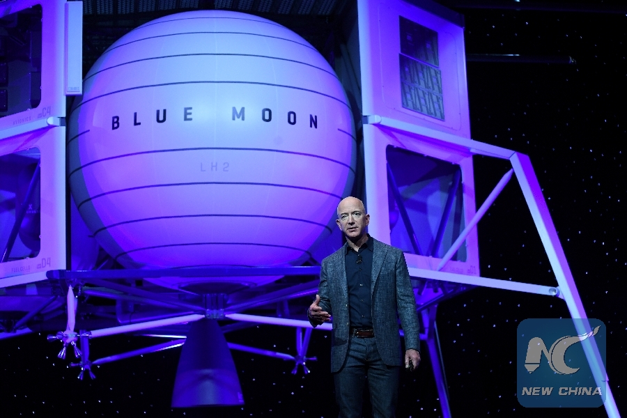 Founder, Chairman, CEO and President of Amazon Jeff Bezos unveils his space company Blue Origin's space exploration lunar lander rocket called Blue Moon during an unveiling event in Washington, U.S., May 9, 2019. (Xinhua/REUTERS)