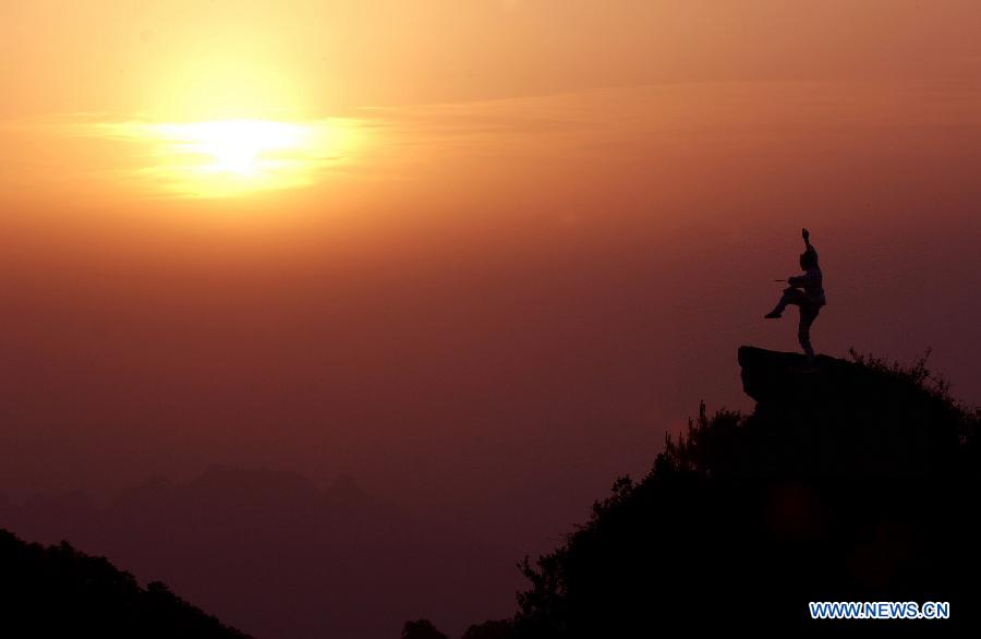 A Taoist priest practices the Wudang martial arts on a peak of the Wudang Mountain, central China's Hubei Province, May 16, 2006. China will hold the Conference on Dialogue of Asian Civilizations starting from May 15. Under the theme of "exchanges and mutual learning among Asian civilizations and a community with a shared future," the conference includes an opening ceremony and sub-forums. (Xinhua/Wang Jianhua)