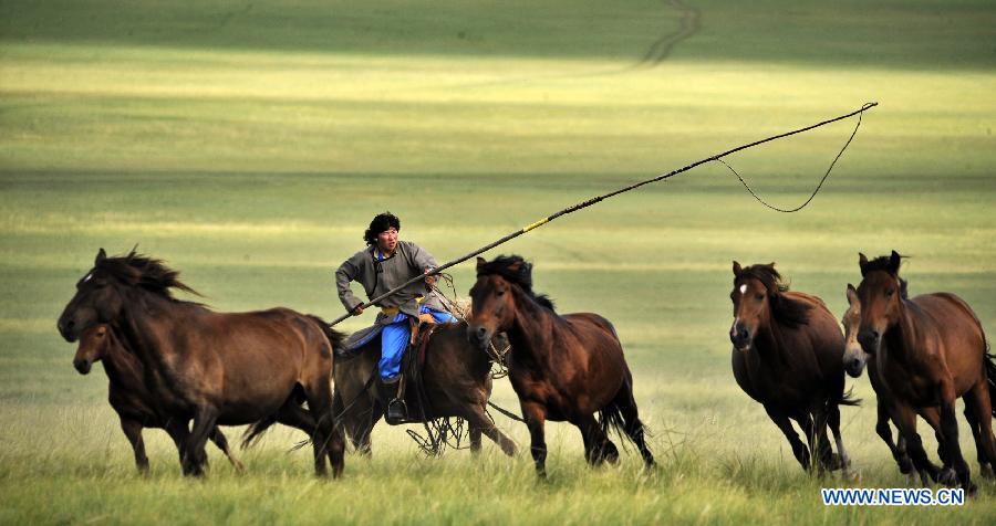 A herdsman lassos horses in Chen Barag Qi on the Hulun Buir Grasslands in north China's Inner Mongolia Autonomous Region, Aug. 27, 2010. China will hold the Conference on Dialogue of Asian Civilizations starting from May 15. Under the theme of "exchanges and mutual learning among Asian civilizations and a community with a shared future," the conference includes an opening ceremony and sub-forums. (Xinhua/Li Xin)