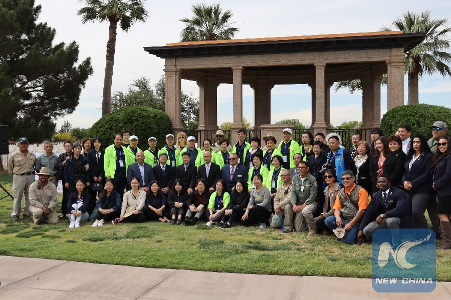 People attending a formal memorial service for Chinese pilots pose for group photos in the Fort Bliss National Cemetery in El Paso, the United States, May 13, 2019. (Xinhua/Liu Liwei)