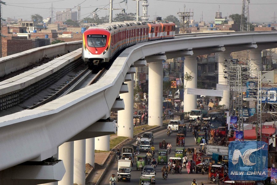Photo taken on May 16, 2018 shows the Orange Line Metro Train (OLMT) during a test run in eastern Pakistan's Lahore. Pakistani Prime Minister Imran Khan said on Wednesday that the China-Pakistan Economic Corridor (CPEC) will bring a host of economic opportunities for the country's southwest Balochistan province, local reports said. (Xinhua/Jamil Ahmed)