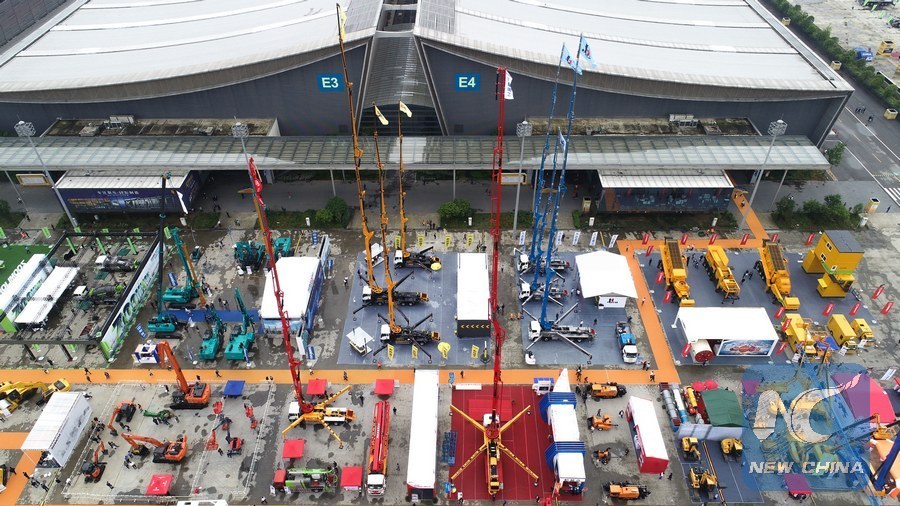 Aerial photo shows the outdoor zone of the 2019 Changsha International Construction Equipment Exhibition in Changsha, central China's Hunan Province, May 15, 2019. The exhibition kicked off here on Wednesday. (Xinhua/Chen Zeguo)
