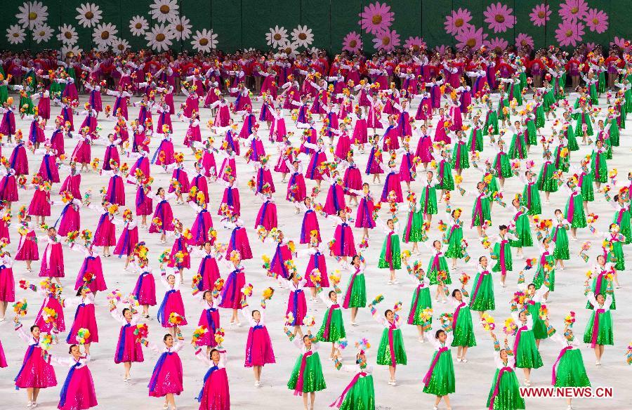 A large group callisthenics and art performance is held at the May Day Stadium in Pyongyang, DPRK, June 20, 2019. Xi Jinping, general secretary of the Central Committee of the Communist Party of China (CPC) and Chinese president, and his wife Peng Liyuan, accompanied by Kim Jong Un, chairman of the Workers' Party of Korea (WPK) and chairman of the State Affairs Commission of the Democratic People's Republic of Korea (DPRK) and his wife Ri Sol Ju, watched the perfromance here on Thursday. (Xinhua/Shen Hong)
