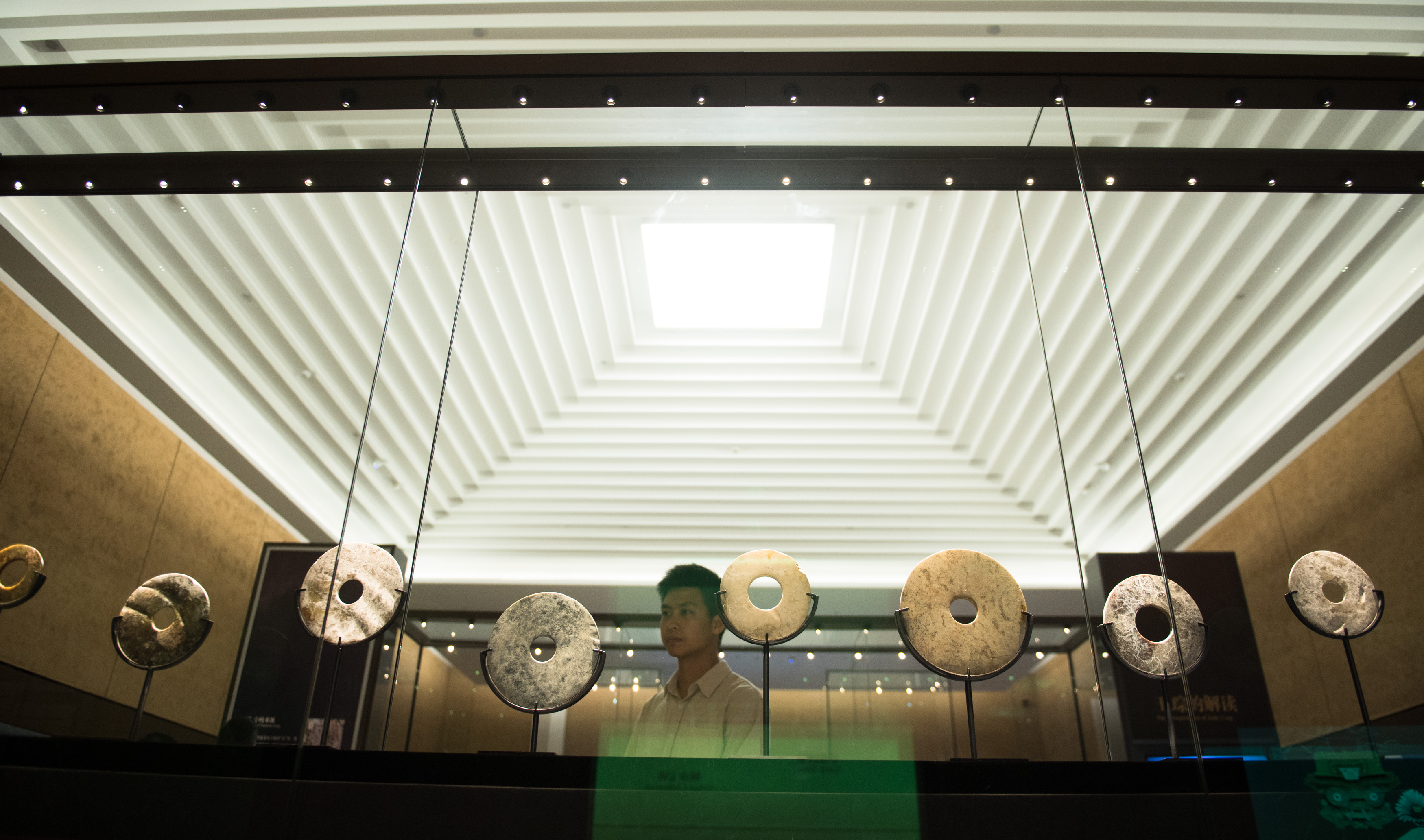 A man looks at jade artifacts excavated from Liangzhu relic site in Hangzhou, capital of east China's Zhejiang Province, June 22, 2019. (Xinhua/Weng Xinyang)
