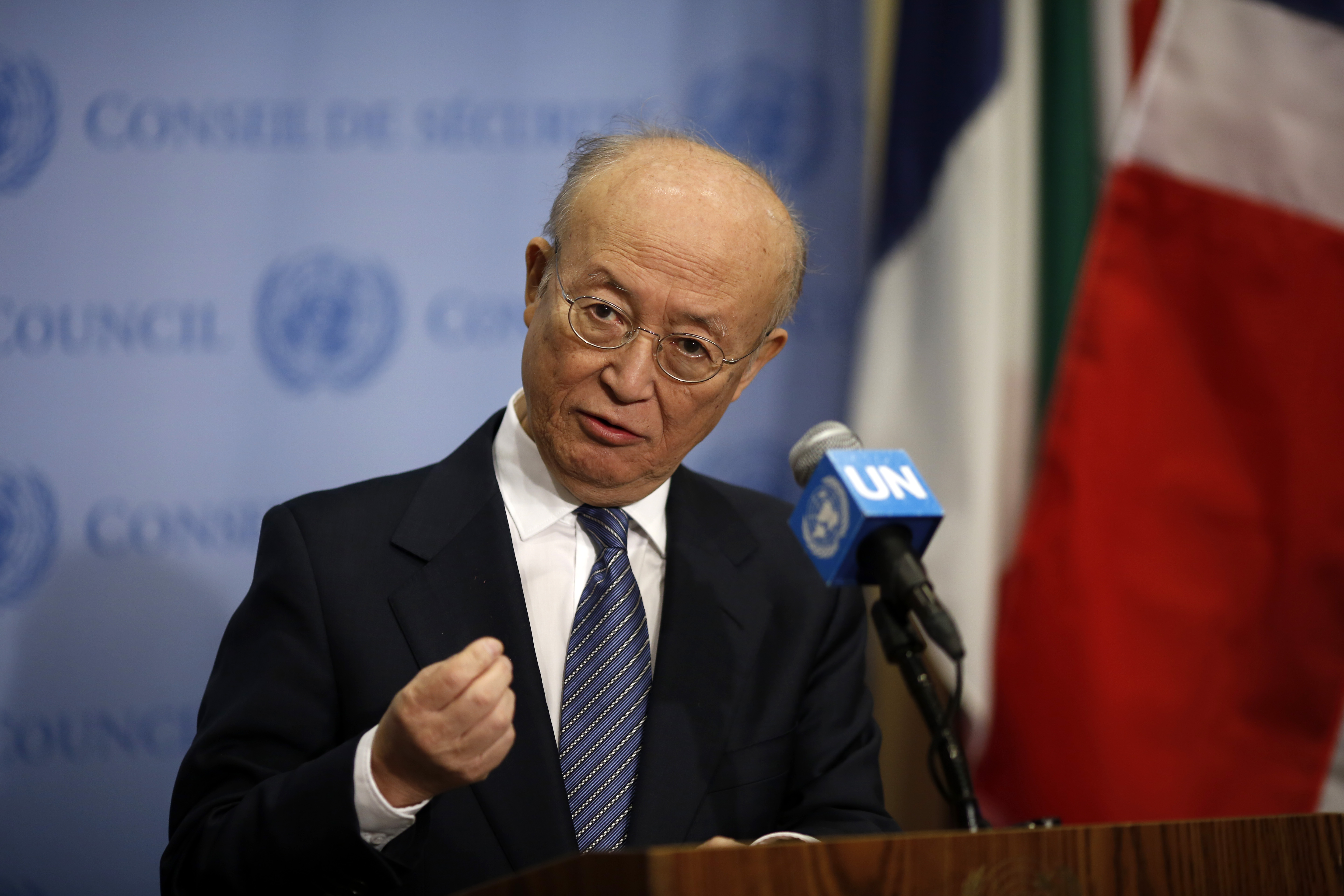 Yukiya Amano, director general of the International Atomic Energy Agency (IAEA), speaks to journalists during a press encounter after the UN Security Council meeting on supporting the Non-proliferation Treaty ahead of the 2020 Review Conference, at the UN headquarters in New York, on April 2, 2019. (Xinhua/Li Muzi)
