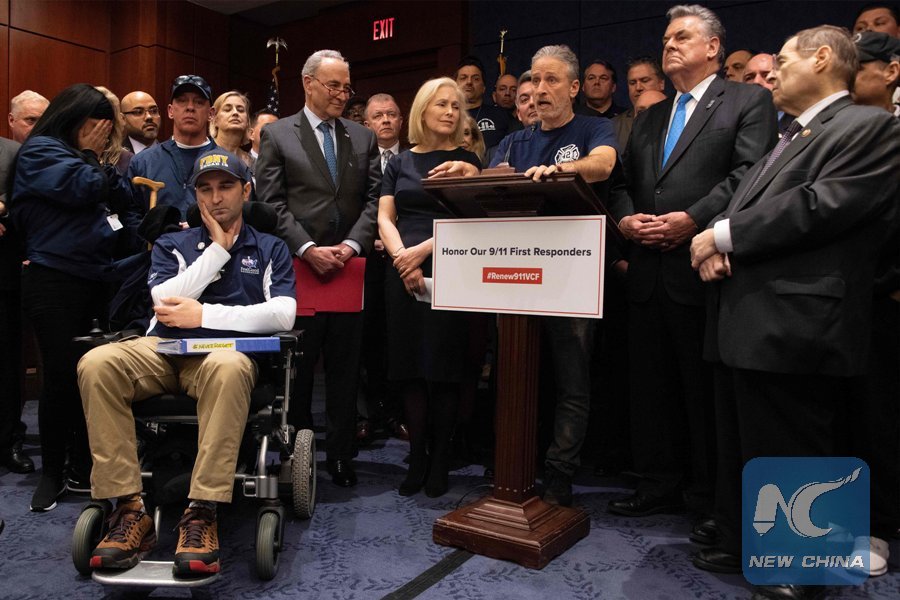 Former "The Daily Show" host Jon Stewart (C) speaks with U.S. Senate Minority Leader Chuck Schumer (2nd R), U.S .Senator Kirsten Gillibrand (R) and 9/11 first responders, survivors and their families, during a press conference on Capitol Hill in Washington, D.C., the United States on Feb. 25, 2019. (AFP Photo)