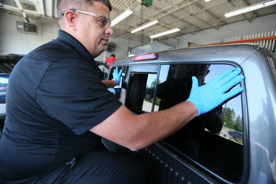 A worker installs glass produced by Fuyao to a car at a car shop in Dayton, Ohio, the United States, July 26, 2019. (Xinhua/Zhang Fengguo)