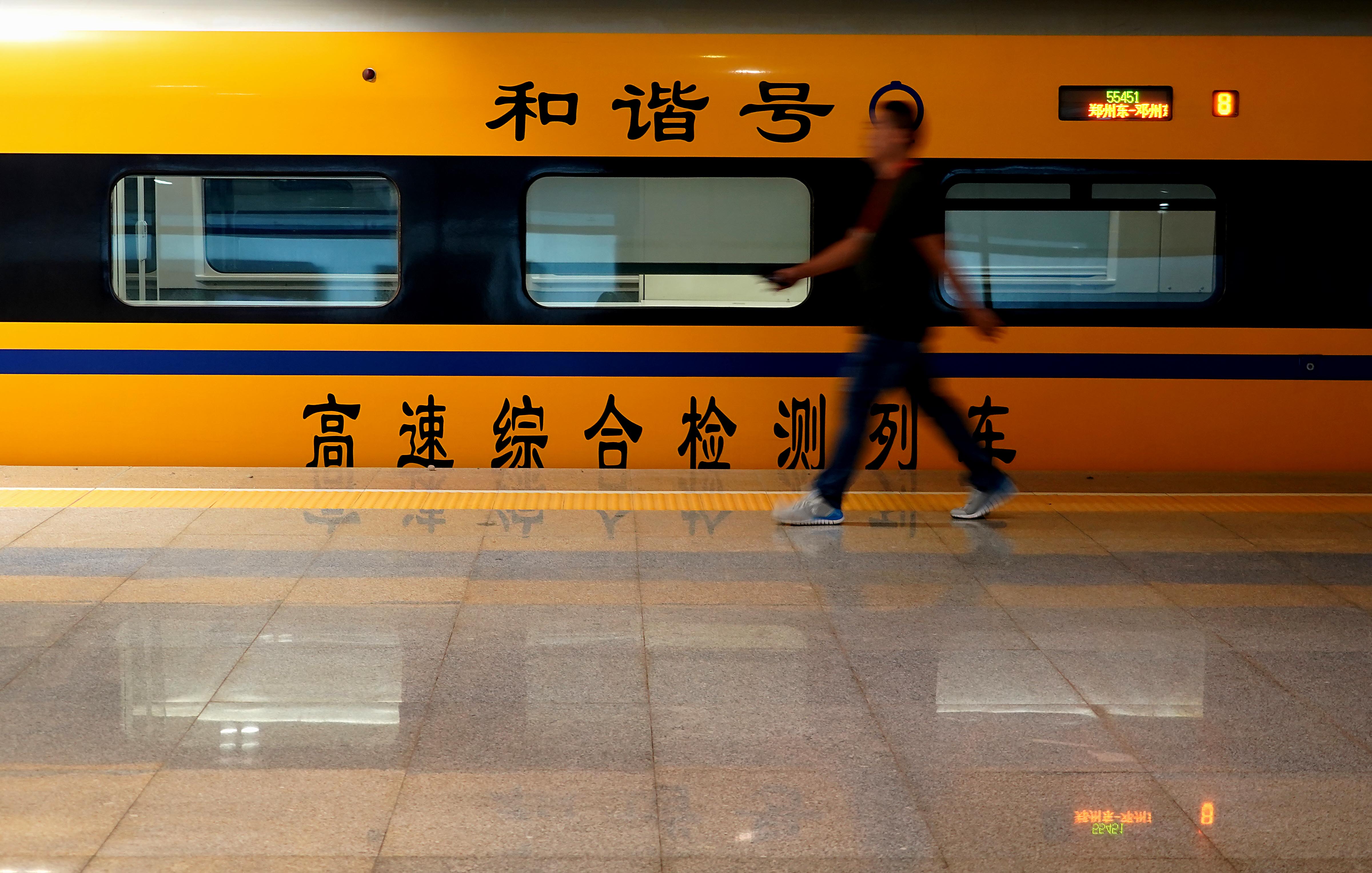 Staff members get on a comprehensive inspection train at Zhengzhou East Railway Station in Zhengzhou, central China's Henan Province. (Xinhua/Li An)