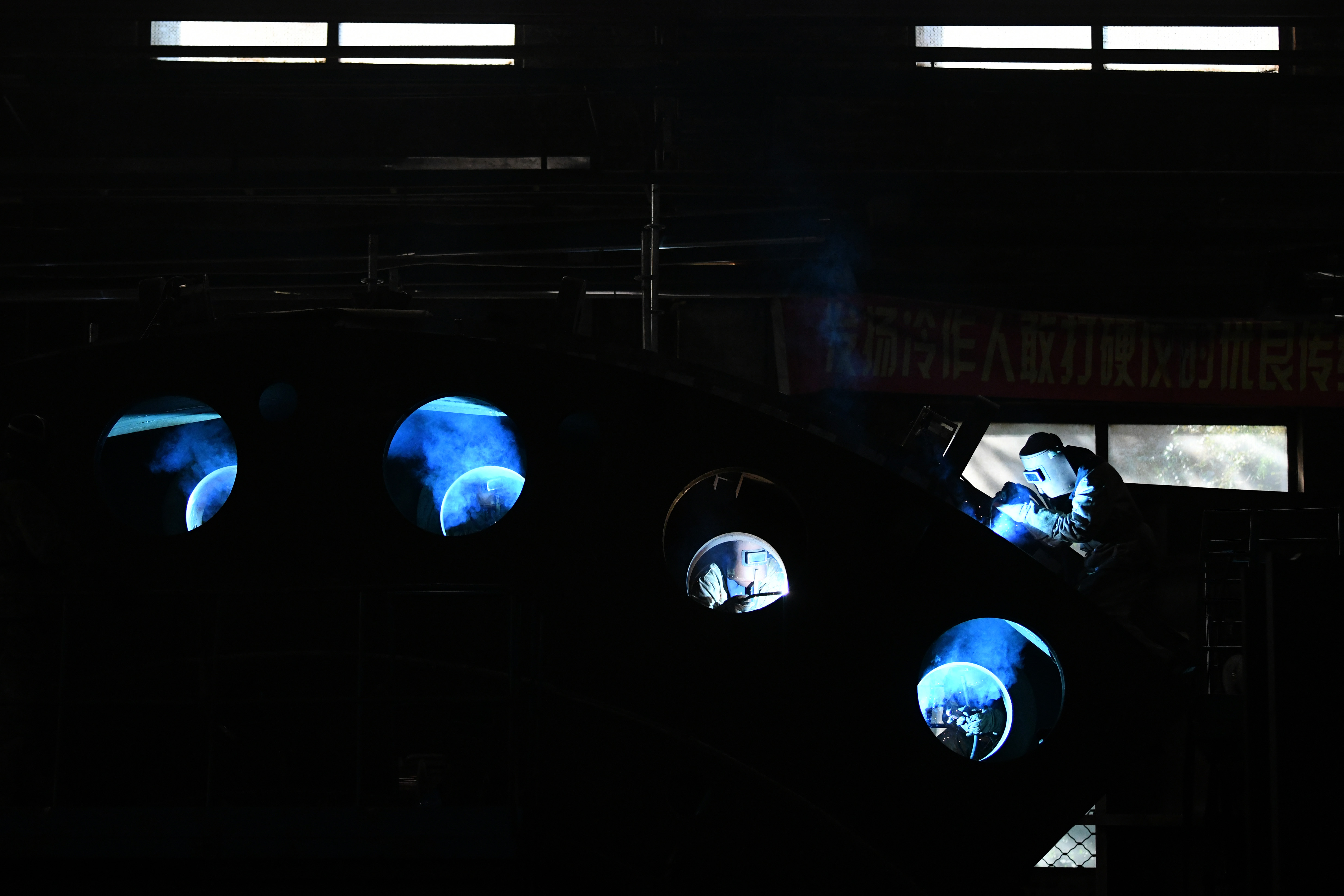 A worker welds components at a factory of Harbin Turbine Company Limited in Harbin, Sept. 3, 2019. (Xinhua/Wang Jianwei)
