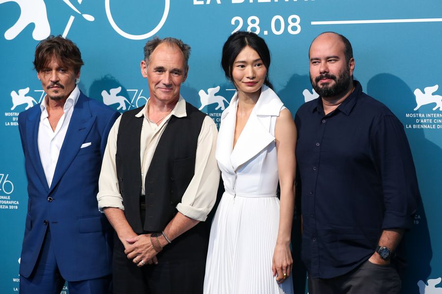 Director Ciro Guerra, actress Gana Bayarsaikhan, actors Mark Rylance and Johnny Depp (R-L) attend a photocall for the film "Waiting for the Barbarians" at the 76th Venice Film Festival. (Xinhua/Zhang Cheng)