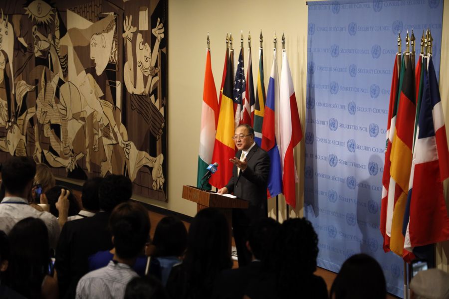 Zhang Jun (C, front), China's permanent representative to the United Nations, addresses a Security Council meeting on the situation in Afghanistan at the UN headquarters in New York on Sept. 10, 2019. (Xinhua/Li Muzi)