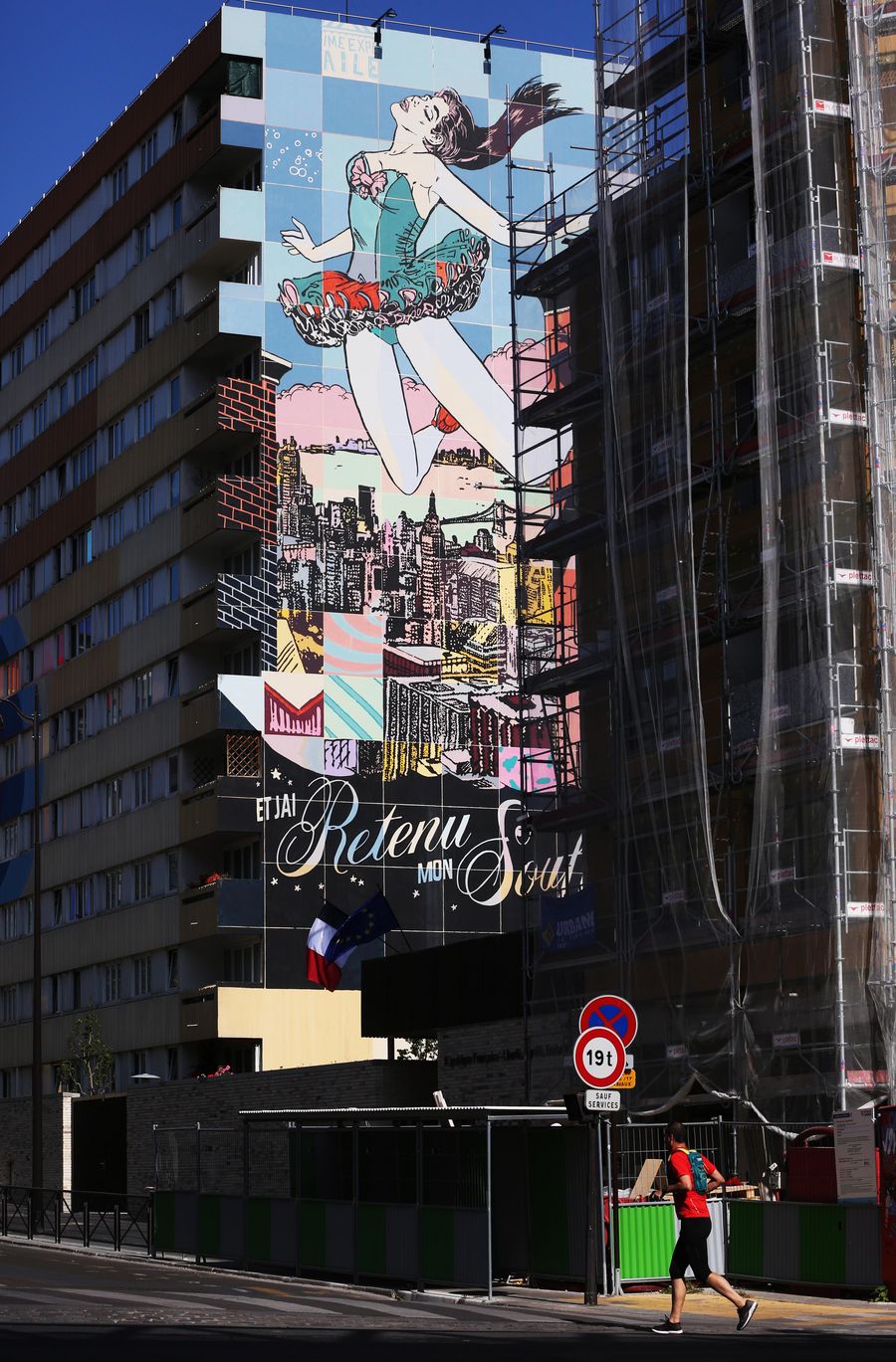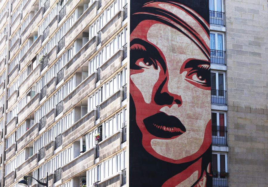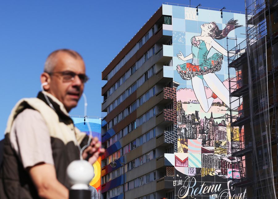 A resident passes by a building with mural paintings at the 13th district in Paris, France. (Xinhua/Gao Jing)
