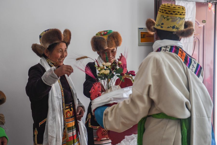 Dainzin Quzhen (1st L) hangs up a hada scarf to her new house in Lhozhag Town of Lhozhag County, Shannan City, Sept. 21, 2019. (Xinhua/Jigme Dorje)