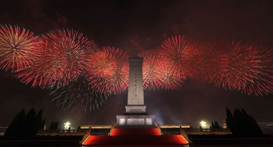 Fireworks explode during a grand evening gala marking the 70th founding anniversary of the People's Republic of China (PRC) in Beijing, capital of China, Oct. 1, 2019. (Xinhua/Jiang Wenyao)