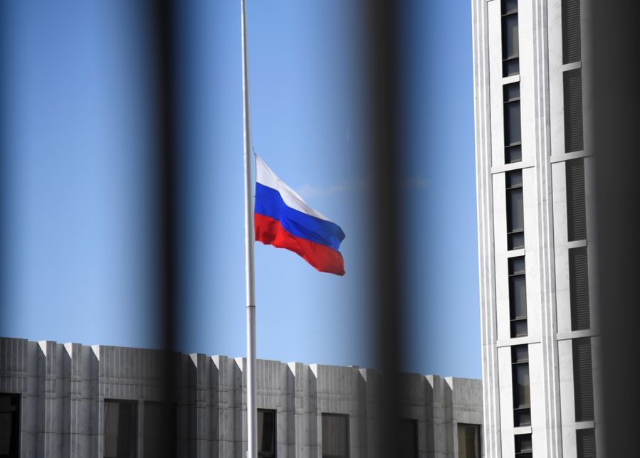 Photo taken on March 26, 2018 shows the Russian national flag at Embassy of Russia in Washington D.C., the United States. U.S. (Xinhua/Yang Chenglin)