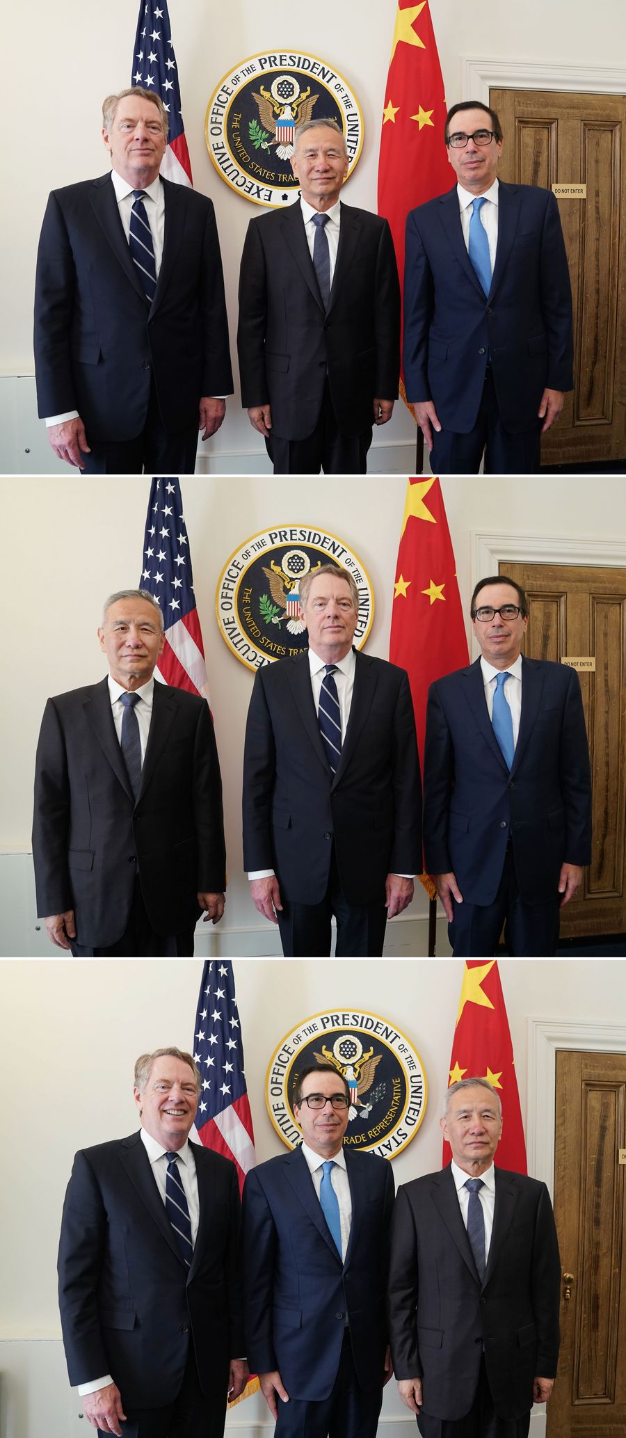 This combo photo shows Chinese Vice Premier Liu He, also a member of the Political Bureau of the Communist Party of China Central Committee and chief of the Chinese side of the China-U.S. comprehensive economic dialogue, attending a new round of high-level economic and trade consultations together with U.S. Trade Representative Robert Lighthizer and Treasury Secretary Steven Mnuchin in Washington D.C., the United States, Oct. 10, 2019. (Xinhua/Liu Jie)