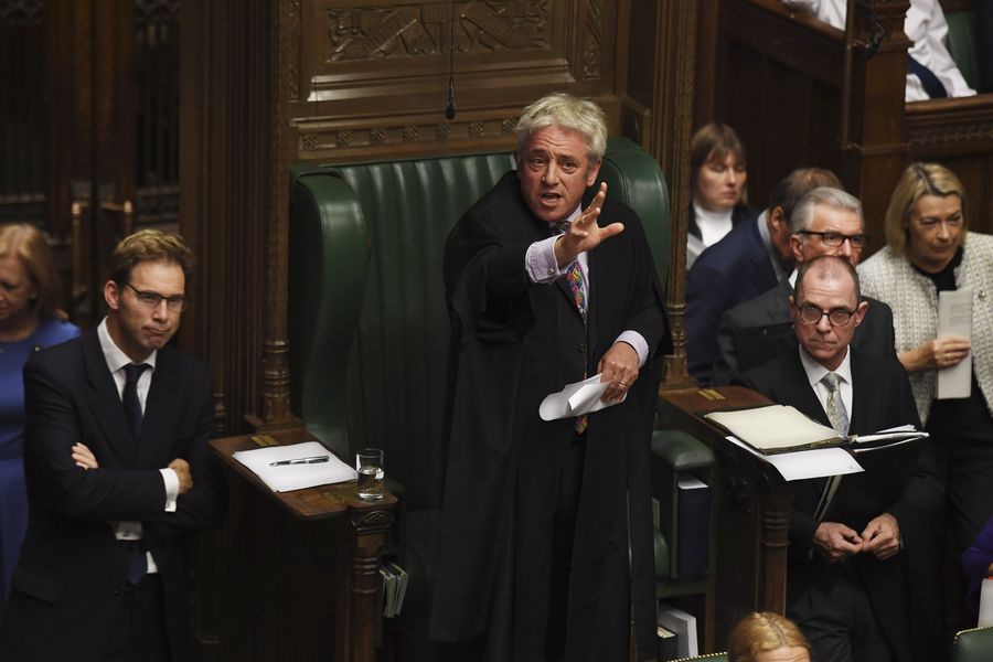 John Bercow (C), speaker of the British House of Commons, speaks at the House of Commons in London, Britain, on Oct. 21, 2019.(Jessica Taylor/UK Parliament/Handout via Xinhua)