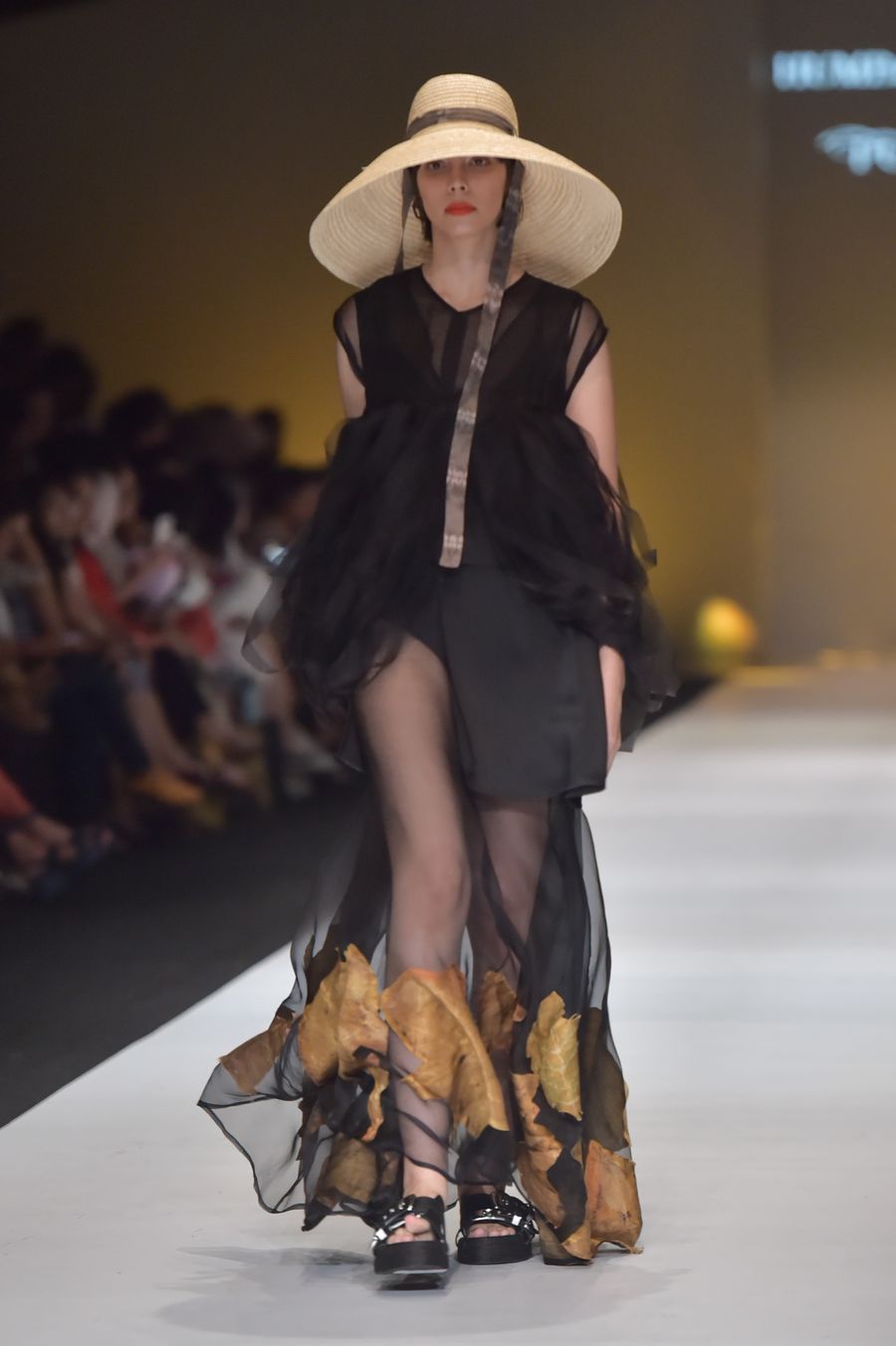 A model presents creations of Humbang Kriya and Purana during Jakarta Fashion Week 2020, in Jakarta, Indonesia, Oct. 24, 2019. (Xinhua/Veri Sanovri)■