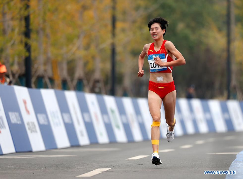 Li Dan of China sprints during the women's marathon individual final of track and field at the 7th CISM Military World Games in Wuhan, capital of central China's Hubei Province, Oct. 27, 2019. (Xinhua/Wang Lili)