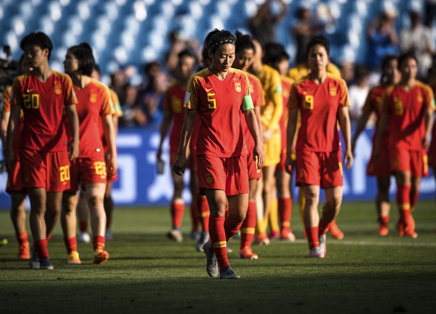 Players of China look dejected after the round of 16 match that China lose 2-0 to Italy at the 2019 FIFA Women's World Cup in Montpellier, France on June 25, 2019. (Xinhua/Xiao Yijiu)