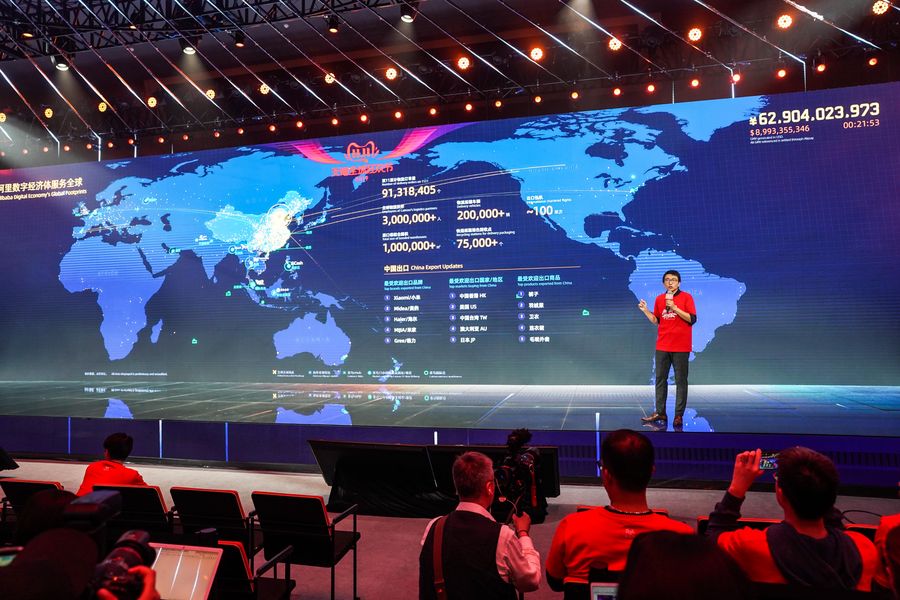 A staff of the Alibaba Group speaks in front of a giant screen showing the real-time sales data of Tmall on Singles' Day at the media center in Alibaba Group's Xixi Park, in Hangzhou, Zhejiang Province, Nov. 11, 2019. (Xinhua/Yin Xiaosheng)