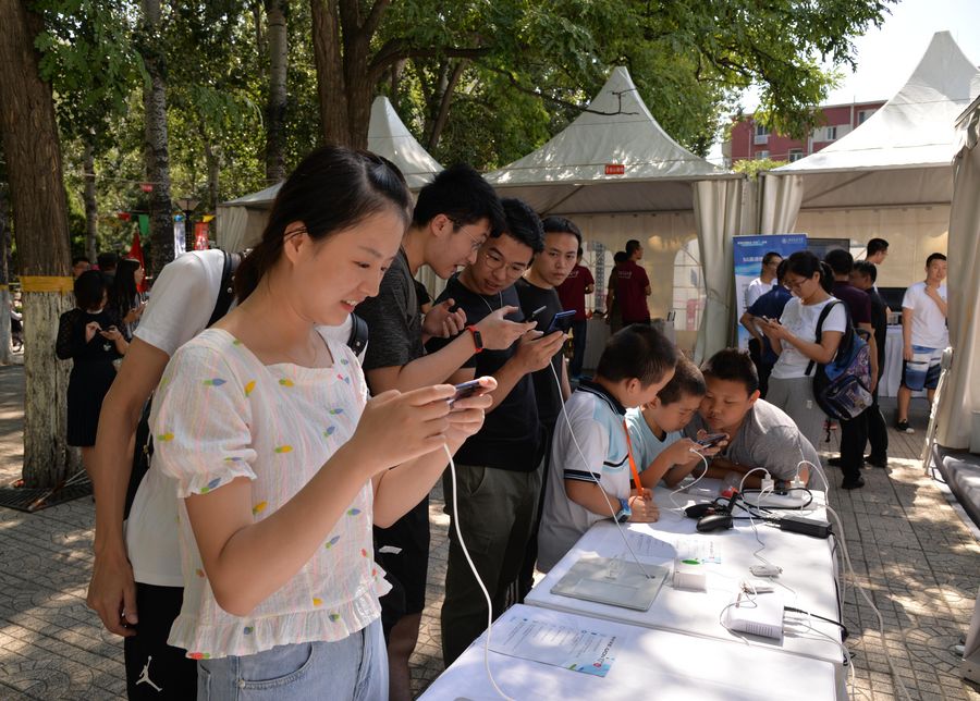 Visitors try ZTE 5G mobile phones at Beijing Jiaotong University in Beijing, capital of China, Aug. 31, 2019. (Xinhua/Xu Qin)