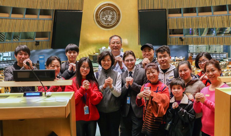 A group of Chinese tourists pose for a photo in the General Assembly hall at the United Nations headquarters, in New York, Feb. 5, 2019. (Xinhua/Ma Jianguo)