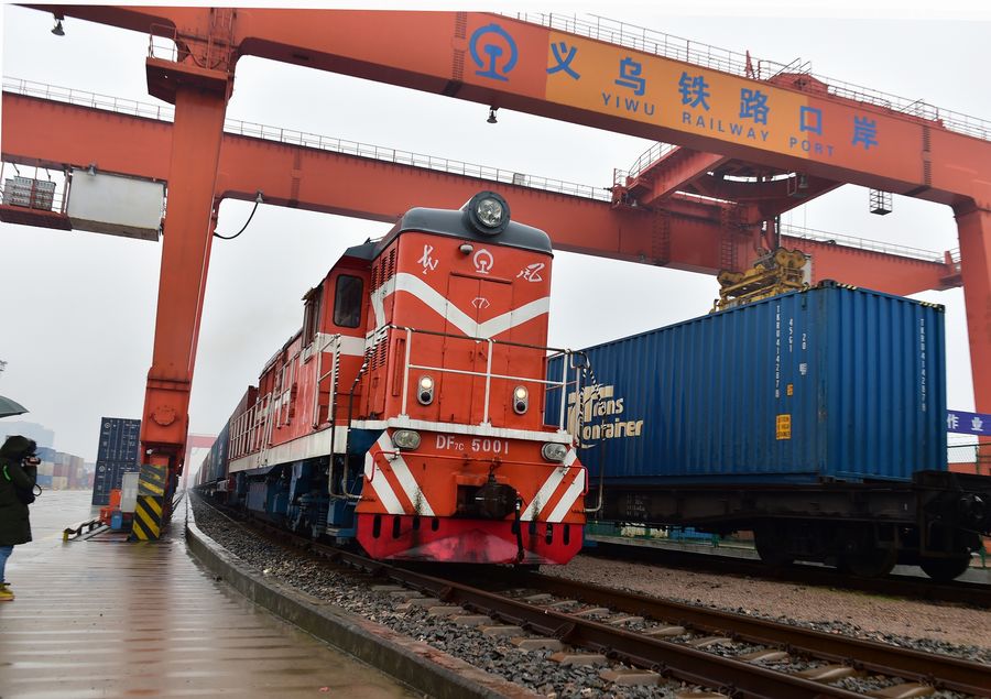 A freight train from Yiwu to Madrid departs from Yiwu Railway Port in east China's Zhejiang Province, Jan. 4, 2019. (Photo by Lyu Bin/Xinhua)