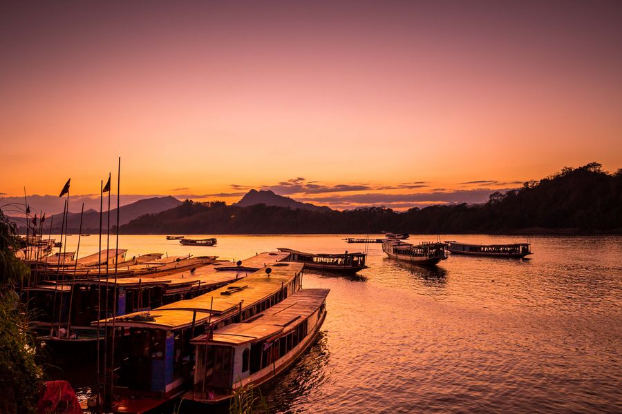 Photo taken on Jan. 1, 2020 shows the sunset scenery of Luang Prabang on the riverside of Mekong River, Laos.(Xinhua/Kaikeo Saiyasane)
