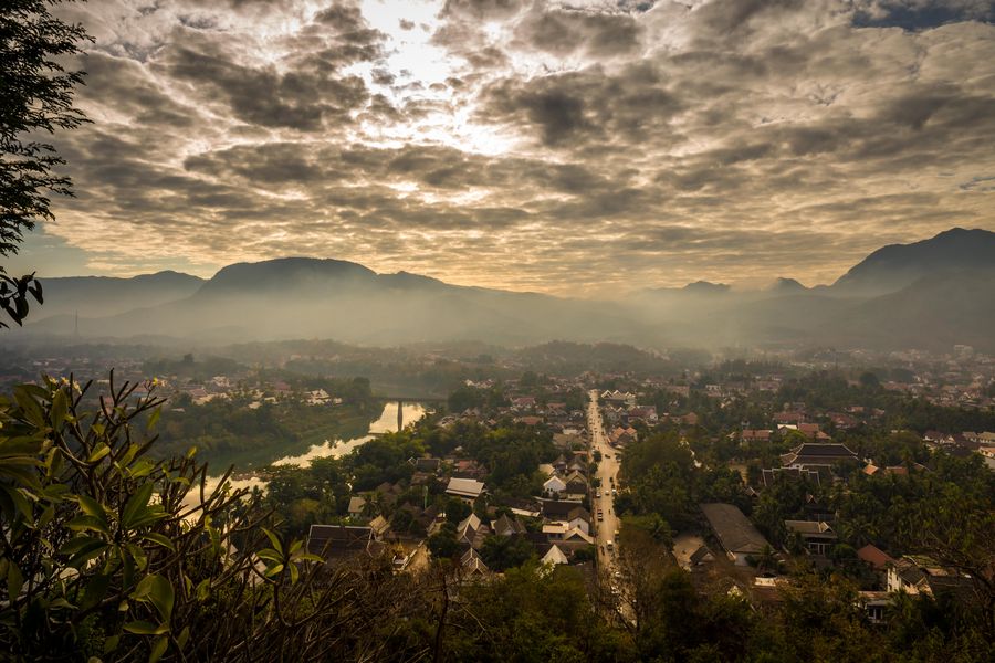 Photo taken on Jan. 2, 2020 shows the sunrise scenery of Luang Prabang on the riverside of Mekong River, Laos.(Xinhua/Kaikeo Saiyasane)