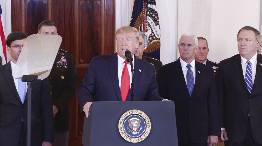 U.S. President Donald Trump delivers a statement at the White House in Washington D.C. Jan. 8, 2020. Donald Trump said on Wednesday that no U.S. casualties have resulted from Iran's missiles attack against U.S. forces in Iraq on Tuesday, adding that the U.S. would impose additional sanctions against Tehran. (Xinhua/Hu Yousong)
