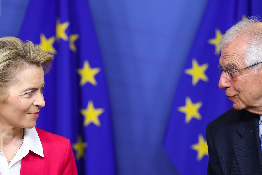 European Commission President Ursula von der Leyen (L) and EU High Representative for Foreign Affairs and Security Policy Josep Borrell Fontelles attend a press conference after a meeting of the College of Commissioners at the EU headquarters in Brussels, Belgium, Jan. 8, 2020. Ursula Von der Leyen called on Wednesday for dialogue instead of war in the Middle East, saying that "the use of weapons must stop now." (Xinhua/Zhang Cheng)