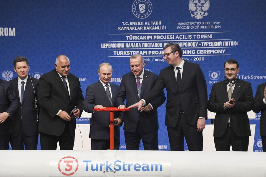 Russian President Vladimir Putin (3rd L), Turkish President Recep Tayyip Erdogan (3rd R), Serbian President Aleksandar Vucic (2nd R) and Bulgarian Prime Minister Boyko Borissov (2nd L) attend the inauguration ceremony of the TurkStream project in Istanbul, Turkey, Jan. 8, 2020. The TurkStream project will deliver Russian gas to Turkey and Europe. (Xinhua/Xu Suhui)