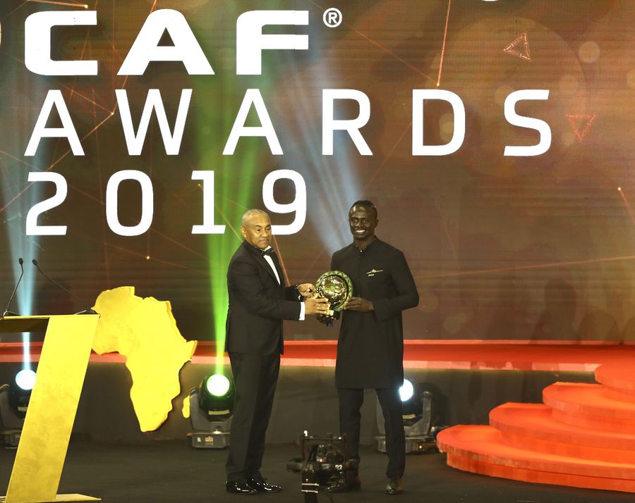 Senegalese football player Sadio Mane (R) receives the Player of the Year award during the 28th Confederation of African Football (CAF) Awards in Hurghada, Egypt, on Jan. 7, 2020. Senegalese Liverpool star Sadio Mane was crowned on Tuesday as African Player of the Year at the CAF Awards 2019. (Xinhua/Ahmed Gomaa)