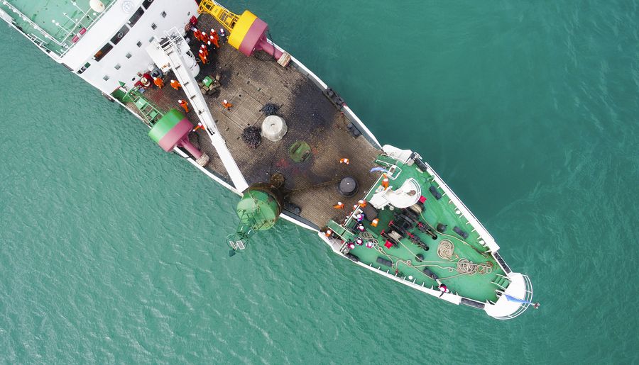 Aerial photo taken on Jan. 8, 2020 shows staff members on the sea patrol ship "Haixun 172" hanging up the old buoy in Qiongzhou Strait, south China. Staff members of the Haikou navigation mark office of the Navigation Guarantee Center of South China Sea (NGCS) of the Ministry of Transport updated the No. 1 buoy in Xiuying Port of Haikou by installing a telemetry and telecontrol unit based on Beidou Navigation Satellite System and Beidou AIS (Automatic Identification System) physical navigation mark on Wednesday. (Xinhua/Yang Guanyu)