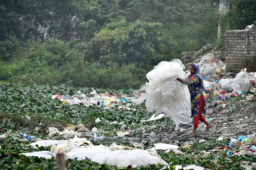 A woman carries plastic waste at a dumping site in Dhaka, Bangladesh on Jan. 8, 2020. A High Court Division bench in Bangladesh has directed the authorities concerned to ban single-use plastic products in coastal areas and hotels, motels and restaurants across the country within the next one year. (Str/Xinhua)