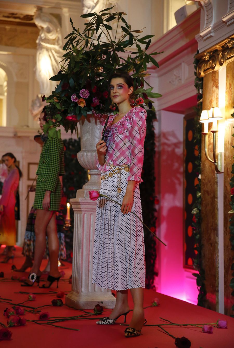 A model is seen on stage during the RIXO presentation at the London Fashion Week at Kimpton Fitzroy London Hotel in London, Britain. (Xinhua/Han Yan)